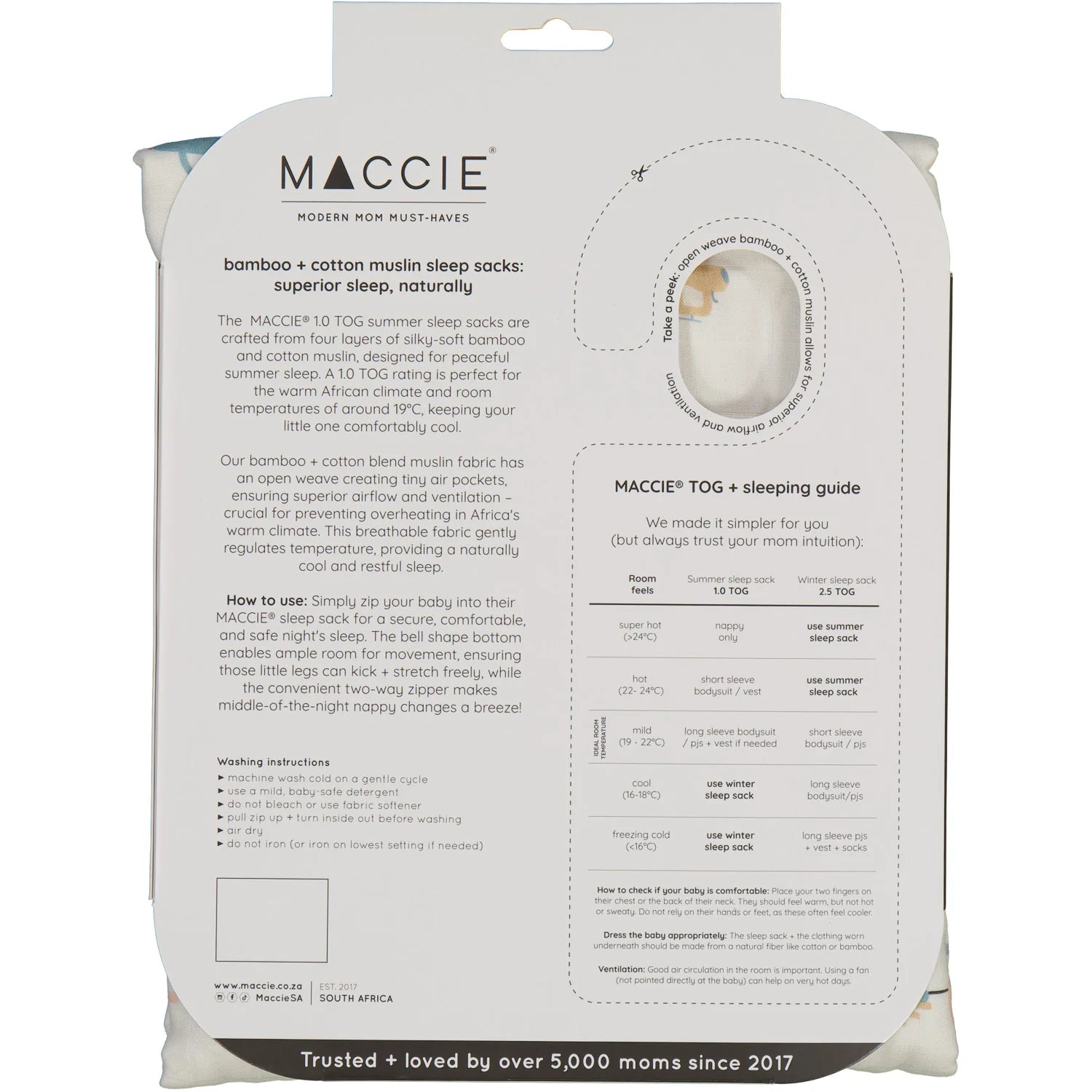 Made from two layers of silky-soft 70% bamboo and 30% cotton muslin, Maccie sleep sacks are lightweight, breathable, and impossible to kick off. The recommended room temperature is 22 - 28 degrees. Maccie muslin sleep sacks have been designed with ample movement room to help little ones sleep safe and sound. A convenient two-way zipper down the middle makes bedtime nappy changes even easier.