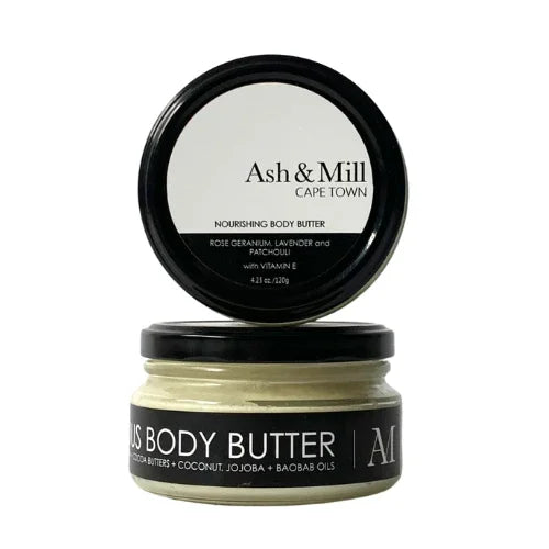 Ash & Mill's nourishing body butter is formulated to melt at your skin's temperature. Containing nourishing shea butter, cocoa butter, coconut oil, jojoba oil, baobab oil, vitamin E and essential oils, this body butter absorbs quickly leaving your skin feeling soft and hydrated.