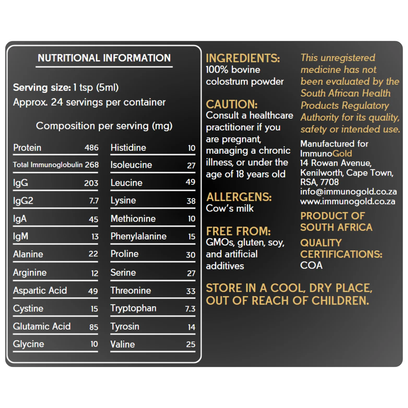 ImmunoGold Colostrum is proudly South African, sourced from free-roaming, hormone-free cows. Rich in immunoglobulins, growth factors, antiviral compounds, and essential nutrients, it provides targeted support your body truly recognizes and uses effectively.
