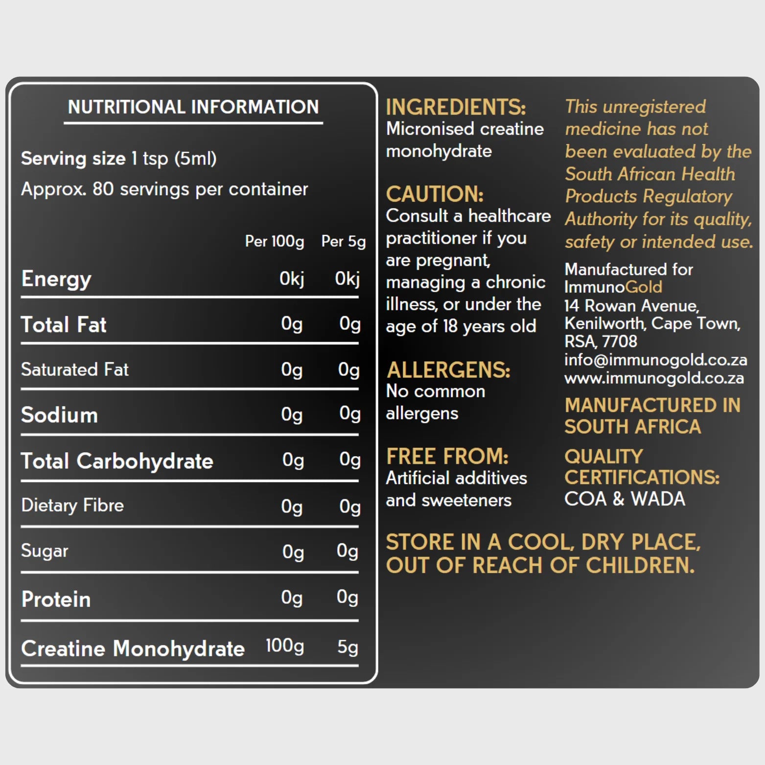 Power your workouts with ImmunoGold Creatine Monohydrate, the ultimate supplement for strength, endurance, and muscle growth, and recovery. Designed to fuel explosive energy, our ultra-pure creatine boosts ATP production, enabling you to train harder and recover faster.